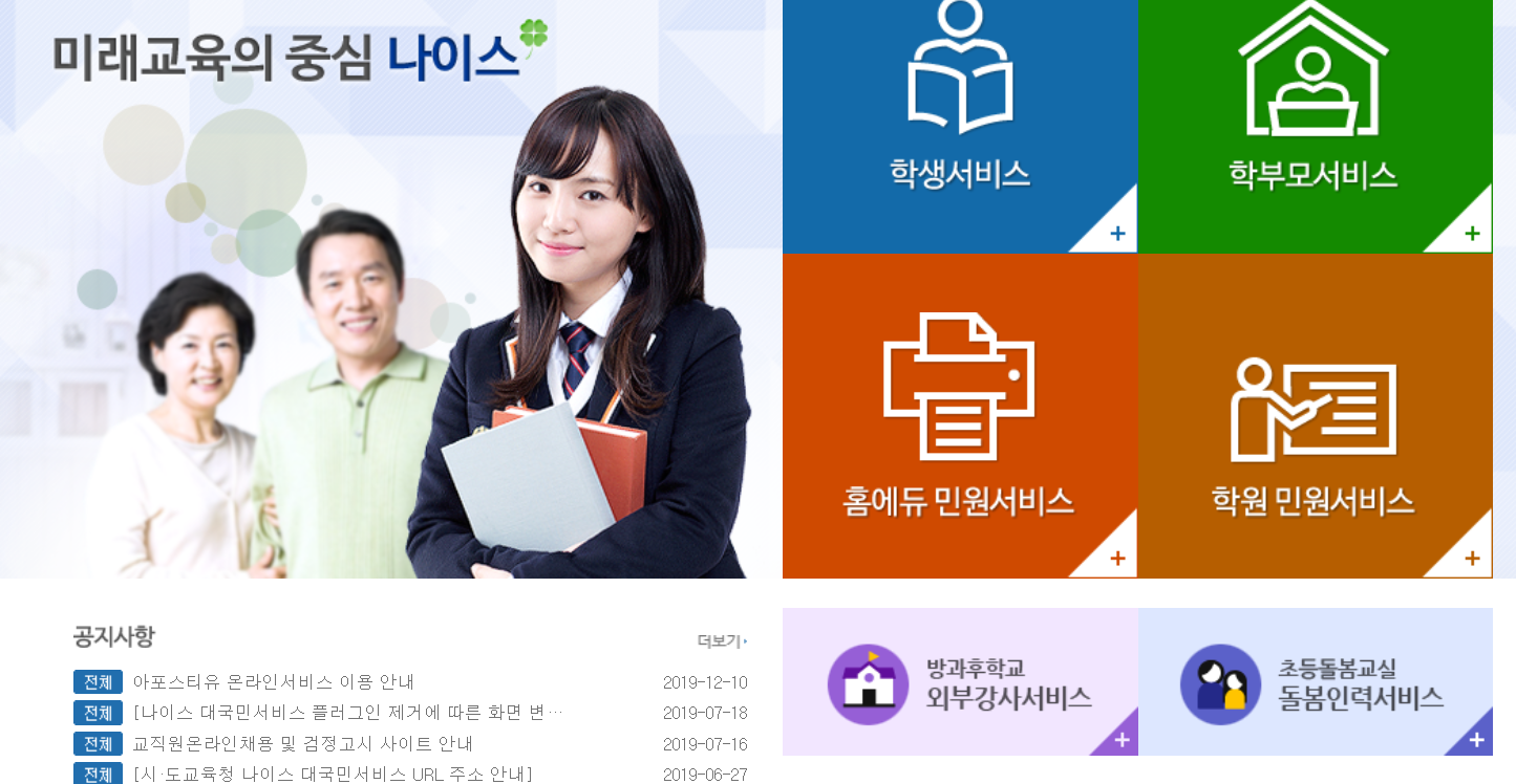 나이스 대국민 서비스는 온라인 홈페이지를 통해서 학생과 학부모 모두가 학교 생활정보를 편하게 확인, 이용할 수 있는 서비스로 학부모 서비스, 학생 서비스, 홈에듀 서비스, 학원 민원서비스등을 제공하고 있습니다.