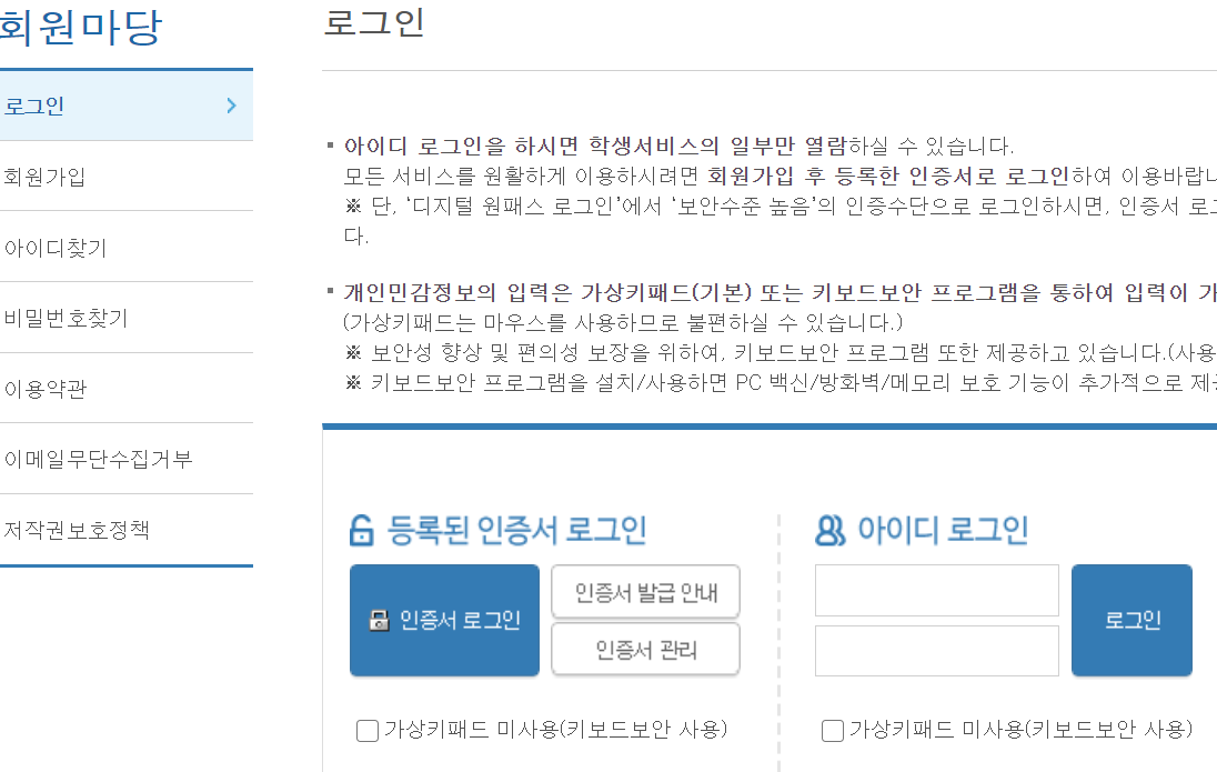 PC 홈페이지를 통해 회원가입 후 로그인해야 모든 서비스를 이용할 수 있습니다. 가입시에는 공동인증서 등록을 해야 합니다. 모바일 서비스를 이용하기 위해서는 앱 설치하고 인증을 진행한 후 이용할 수 있습니다. 단, 학생 모바일 서비스는 PC에서 가입을 진행 후 이용 가능합니다.