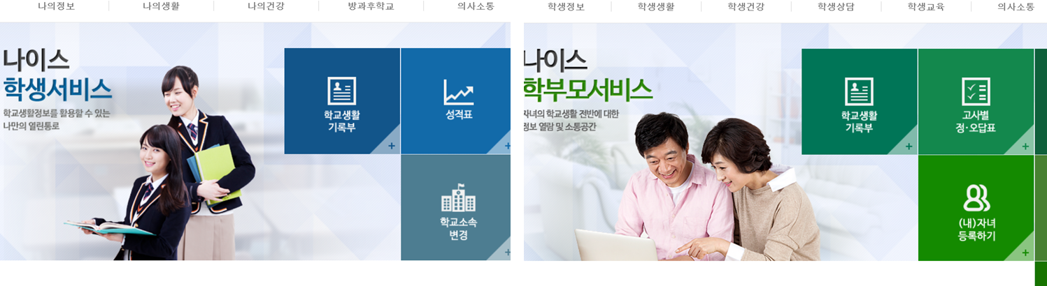 학생 및 학부모가 각자의 서비스를 제공받으며, 학교 생활 기록부, 성적표등을 열람하거나 학사일정, 봉사활동등 각종 내용을 홈페이지를 통해 모두 열람 가능합니다.